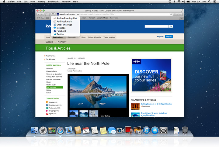 В Safari добавлены новые функции для пользователей, говорящих по-китайски. Baidu — ведущая китайская поисковаяслужба — теперь встроена в поле поиска.В Mountain Lion популярный китайский сервис микроблогов Sina Weibo встроен в меню «Отправить». Пользователям, которые говорят на китайском, достаточно нажать кнопку «Отправить» и выбрать «Sina», чтобы отправлять ссылки прямо из Safari.